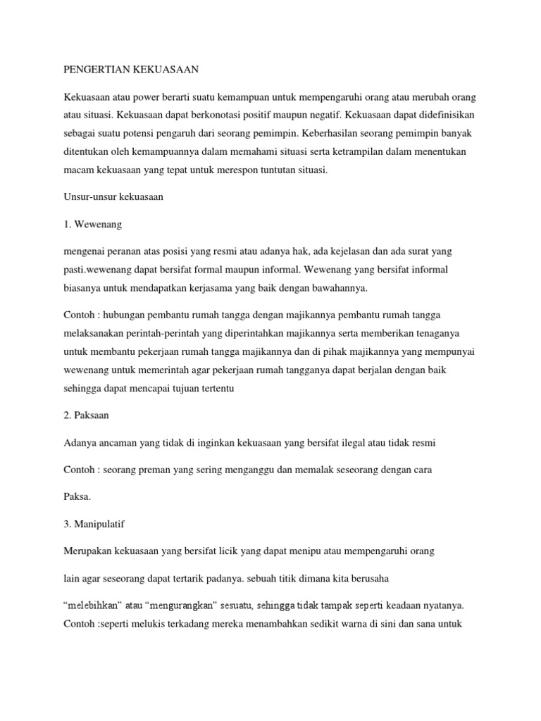 Pengertian Kekuasaan (Power) dan 5 Jenis Kekuasaan dalam ... Jadi pada dasarnya, yang dimaksud dengan Kekuasaan (Power) adalah kemampuan memengaruhi orang lain untuk bersedia untuk melakukan sesuatu yang diinginkannya. Kemampuan untuk memengaruhi orang lain merupakan inti penting dari Kepemimpinan.